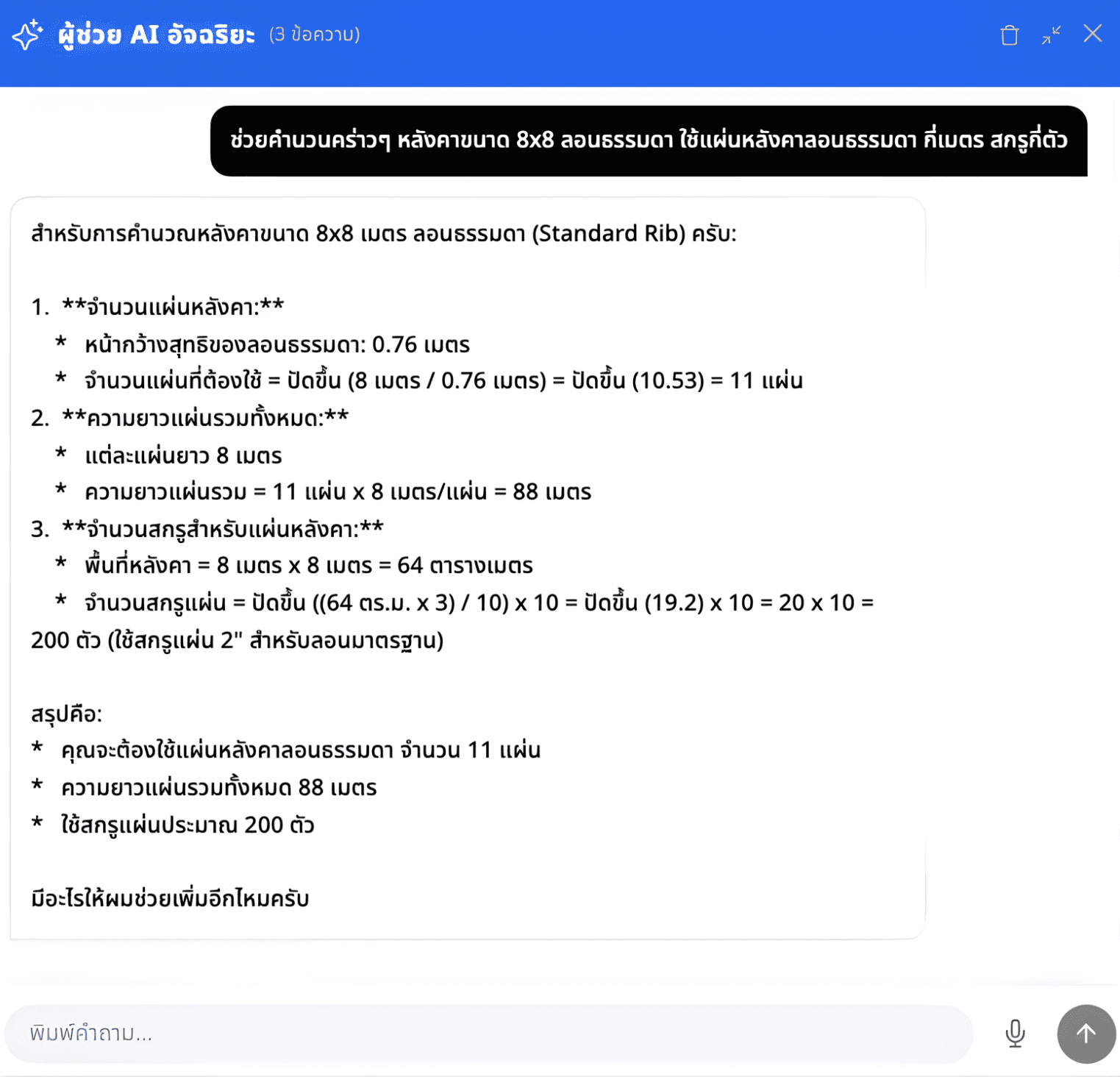 หน้าจอระบบผู้ช่วย AI สำหรับช่วยคำนวนหรือตอบข้อมูลเทคนิคของสินค้า