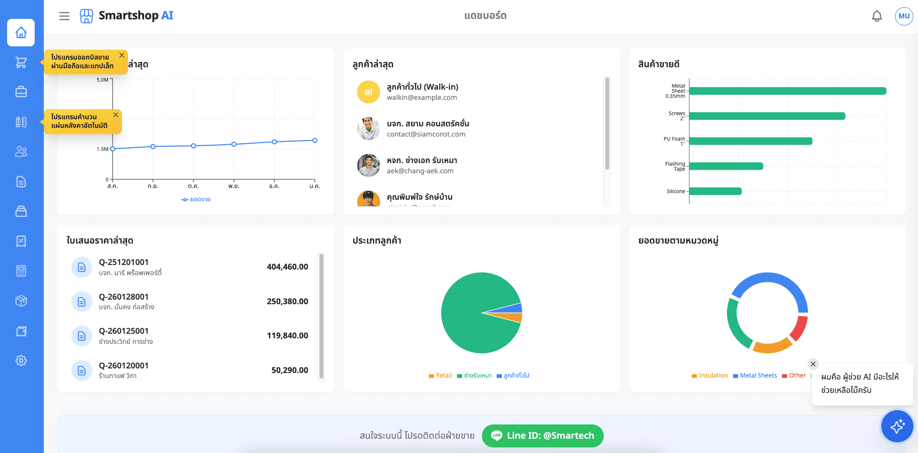 ระบบบริหารงานขายที่ออกแบบมาเพื่อธุรกิจเมทัลชีทโดยเฉพาะ ครอบคลุมทุกขั้นตอนของงานขาย ตั้งแต่การให้ข้อมูลลูกค้า การถอดแบบ ประมาณราคา ไปจนถึงการจัดทำใบเสนอราคา ช่วยเสริมศักยภาพให้ทั้งทีมขายโครงการและทีมงานหน้าร้านทำงานได้อย่างเป็นระบบและมีประสิทธิภาพ