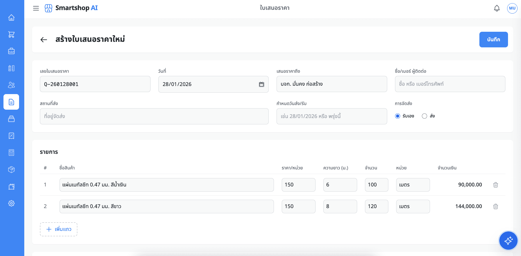 หน้าจอใบเสนอราคา สำหรับงานขายหน้าร้าน และ สำหรับเซลโครงการ สามารถออกเอกสารที่หน้างานได้ทันที