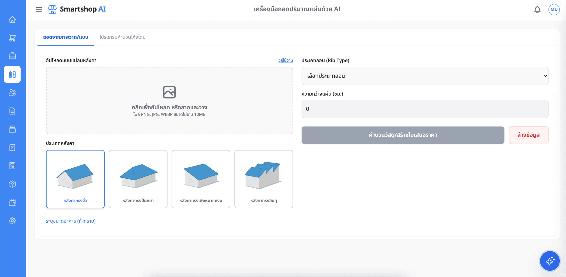หน้าจอระบบประเมินราคาจากแบบหลังคา สำหรับประเมินราคาเบื้องต้นได้เองด้วย AI ไม่ต้องรอถอดแบบให้เสียเวลา